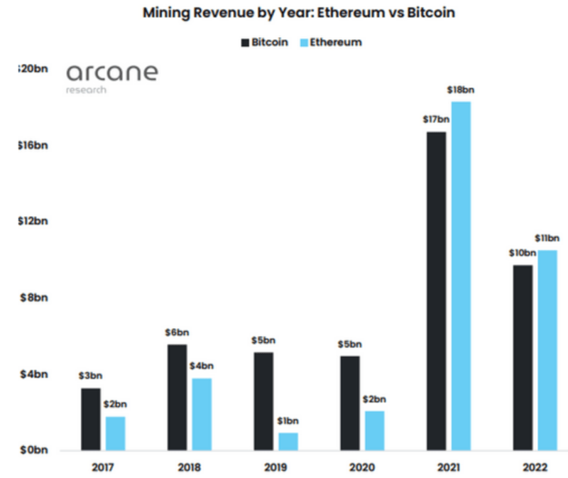 그리고 일부 채굴자가 수익성이 낮은 PoS와 교환하여 수익성있는 PoW 메커니즘을 포기하고 싶지 않았기 때문입니다.Arcane Research의 새로운 보고서에 따르면 이더리움 채굴 수익은 2021년에 180억 달러에 이를 것이며 이는 비트코인의 170억 달러 수익을 약간 앞질 것입니다. 2022년 하반기에도 이더리움 채굴자들의 수입은 꾸준히 차트 1위를 차지했습니다. 아래 차트는 지난 2년 동안 시가 총액에 따라 가장 중요한 두 가지 디지털 통화의 채굴 보상을 비교합니다.