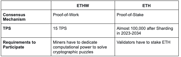 머지 이후 이더리움 네트워크는 PoS 합의 알고리즘을 사용하는 ETH와 이전 PoW 알고리즘을 사용하는 ETHW의 두 가지 버전으로 분할되었습니다. 즉, ETHW 채굴자는 복잡한 수학 문제을 해결하여 이더리움 토큰 형태로 보상을 받는 반면 검증인은 ETH 스테이킹을 통해 수익을 얻습니다.