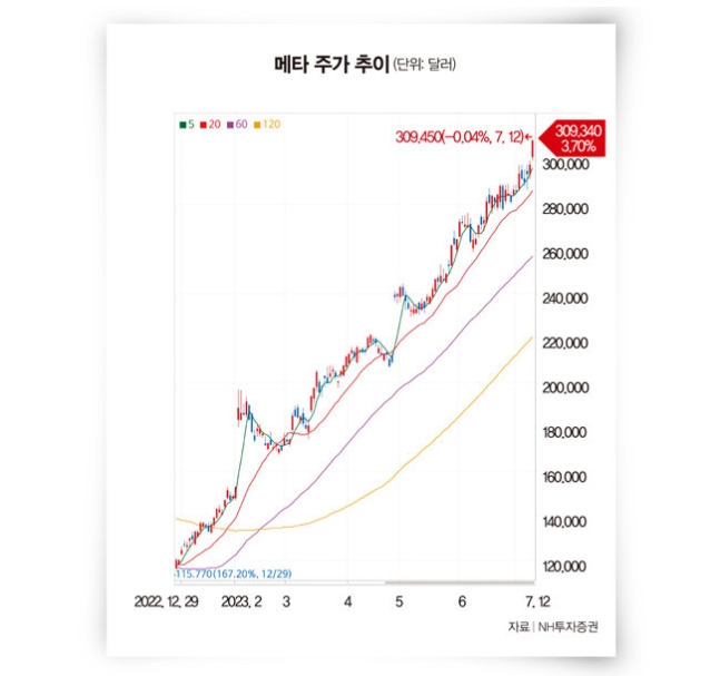 스레드의 등장은 증시에도 영향을 미치고 있다. 그간 실적 부진으로 주춤했던 메타 주가는 스레드 출시 이후 부활을 알렸다. 7월 12일(현지 시간) 메타 주가는 309.34달러(약 39만4000원)에 장을 마감했는데, 이는 스레드 출시 직전인 7월 3일 286.02달러(약 36만4000원) 대비 약 8% 오른 수치다(그래프 참조). 메타 주가가 300달러를 넘어선 것은 지난해 1월 25일 이후 처음이다.