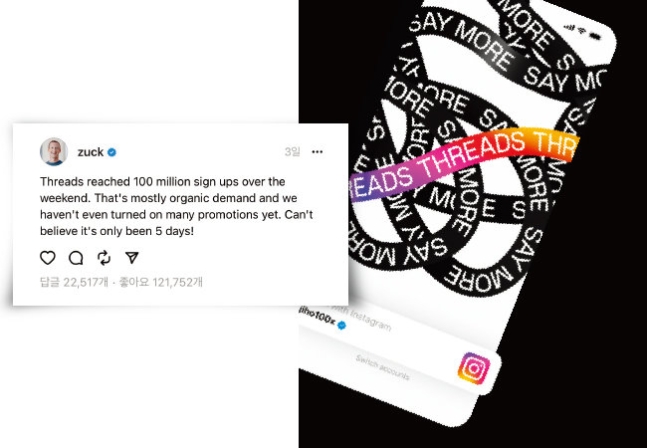 이를 두고 마크 저커버그 메타 최고경영자(CEO)는 7월 10일 자신의 스레드 계정을 통해 “아직 별다른 프로모션을 하지도 않았는데, 믿기지 않는다”고 말했다. 국내에서도 스레드는 출시 닷새 만에 애플리케이션(앱) 설치자 수 100만 명을 돌파한 것으로 집계됐다.