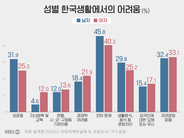 남녀 통틀어 언어 문제(43.3%)가 가장 힘든 부분이었습니다. 그 뒤를 외로움(28.8%)과 생활방식·음식 등 문화차이(27.8%)가 이었습니다. 경제적 어려움을 겪는 경우도 20%나 됐습니다.
