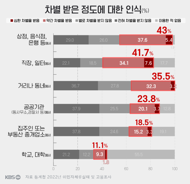 이 밖에는 '공공기관(23.8%)', '집주인 또는 부동산 중개업소(18.5%)'가 그 뒤를 이었습니다. '학교·대학'에서 차별을 느꼈다는 답변은 11.1%로 가장 낮았습니다.