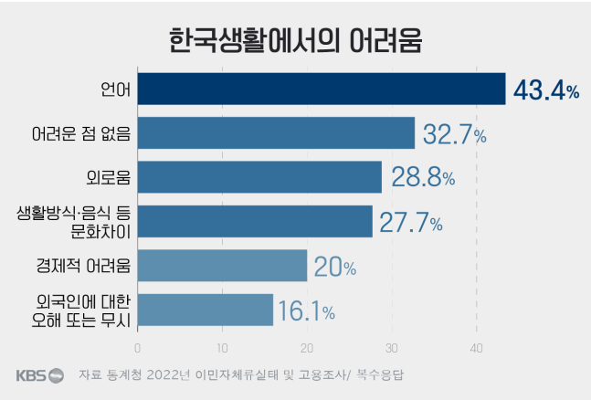 만족도가 높더라도, 타지에서 지내는 게 마냥 쉽지는 않을 겁니다. 외국인에게 어떤 점이 어려웠는지도 물어봤습니다.