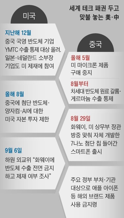 IT 업계 관계자는 “미국이 4년 동안 반도체 생산 기술과 제조 장비 공급을 막았지만 결과적으로 중국 반도체 굴기 저지에 실패하면서 더 강도 높은 제재안을 내놓을 가능성이 높아졌다”며 “테크 패권을 걸고 시작된 양국의 싸움이 어디까지 번질지 예측하기 힘든 상황”이라고 말했다.